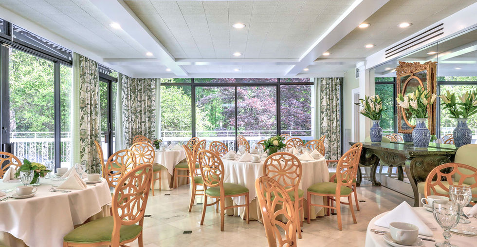 A bright room on the upper floor with floor-to-ceiling windows and a private terrace. The space can accommodate 40 people seated at 5 round tables.